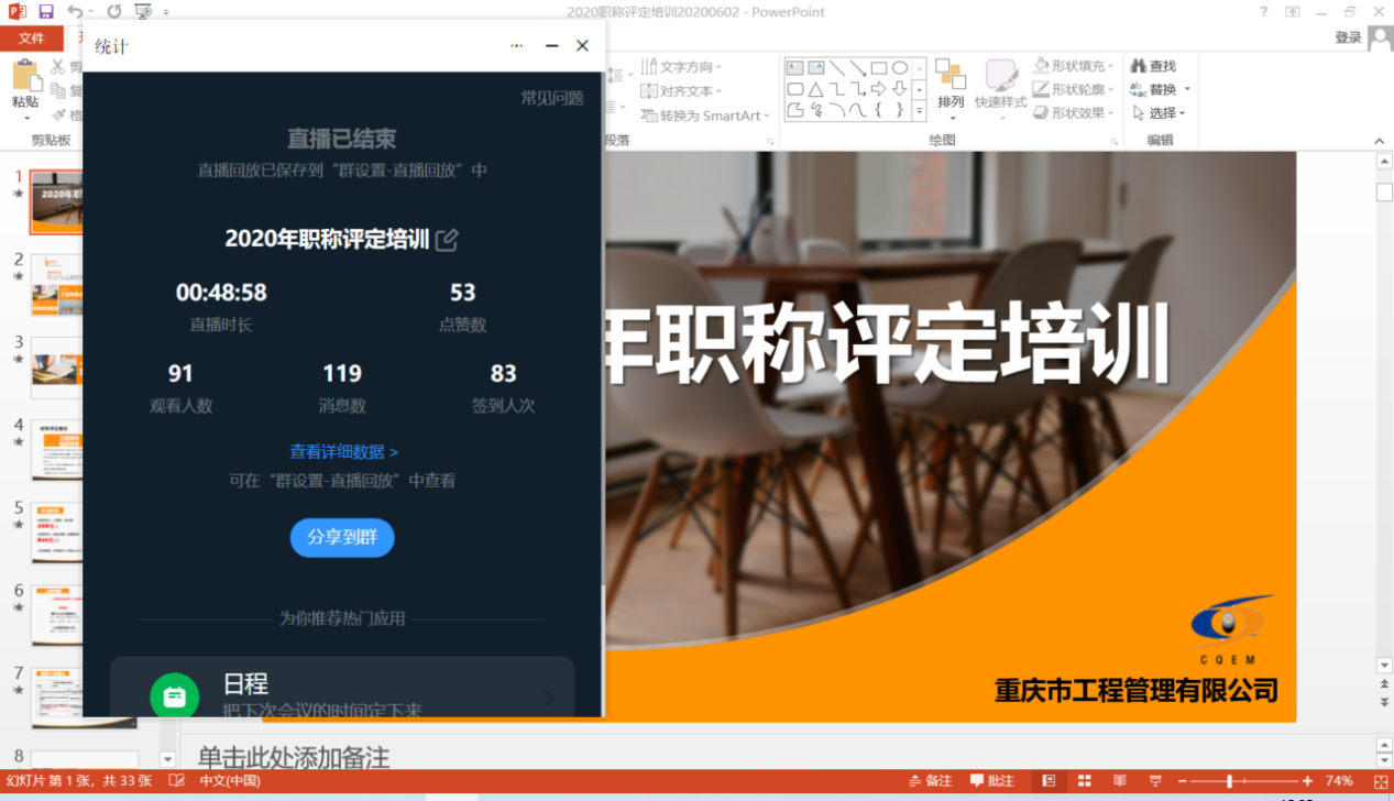 2020年6月4日下午2:30,工管公司综合办组织召开2020年职称评定线上直播培训集会。培训集会由综合办赵曦主讲,首次接纳了线上直播培训模式,共有91人加入本次直播培训。